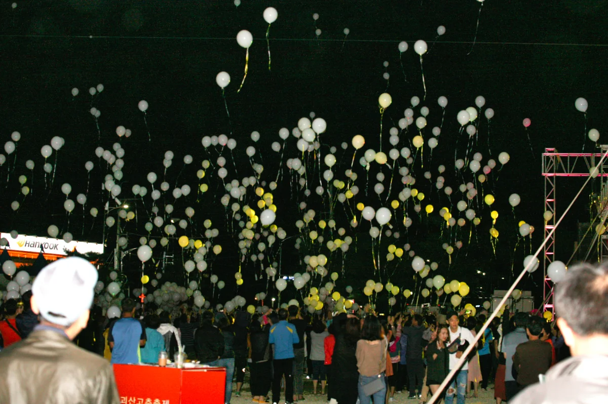 시간 가는 줄 모르고 관람을 하다가 어느 덧 저녁이 되었습니다. 저녁 시간이 되자, 야간 공연을 보기 위해 모인 관람객과 괴산 시민들이 자리를 가득 메웠습니다. 특히 다문화 행사로 한국으로 시집와서 살고 있는 외국인 여성분들의 공연이 있었는데, 나름 볼거리를 제공했습니다. 그리고 당일 마지막 이벤트는 소망을 담은 풍선을 날리며 괴산 지역의 축복을 기원하는 뜻깊은 순간으로 성황리에 마무리되었습니다.