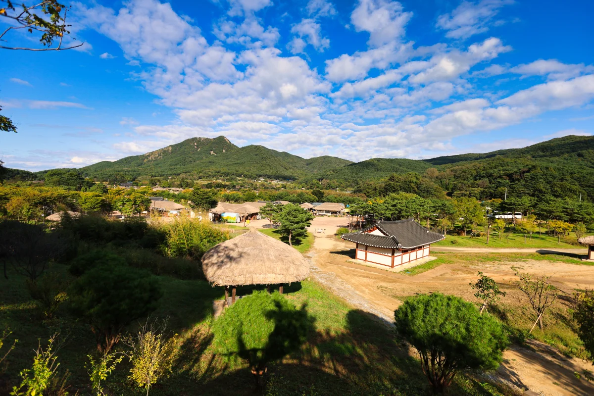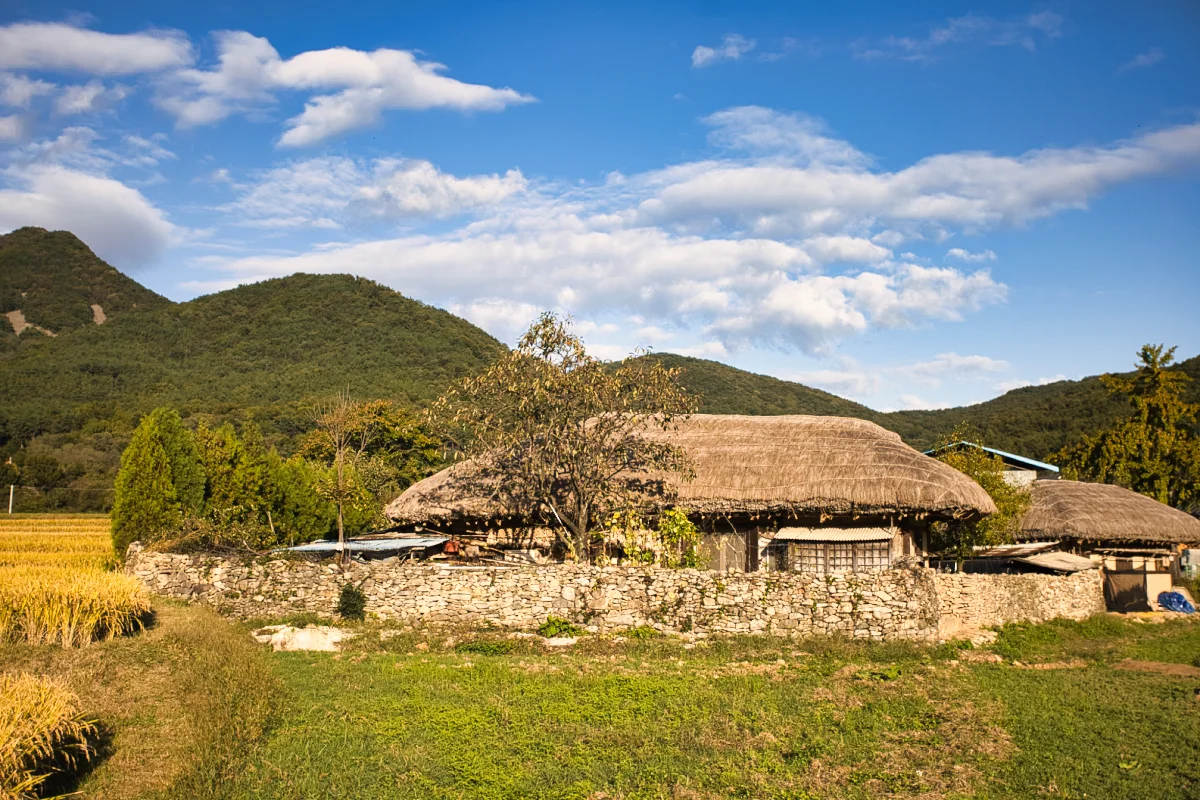 충청남도 아산시 송악면 외암리에 자리한 외암마을의 가을 풍경입니다. 몇 해 전에 외암리 민속 마을을 방문했을 때, 날씨는 온화하고 청명했으며, 어여쁜 구름 조각들이 하늘에 떠 있었습니다.